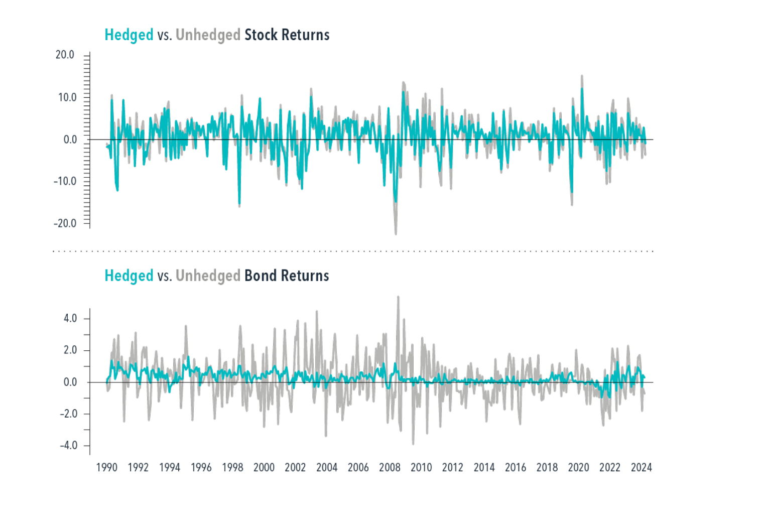 Currency movements can influence returns on international investments, but whether to hedge that exposure depends on the asset class. For global equities, most volatility comes from stock price movements rather than currency shifts, meaning hedging typically provides little additional stability. Global bonds, on the other hand, are naturally less volatile, so currency swings have a bigger impact. In this case, hedging can meaningfully reduce volatility and help maintain the steadiness investors expect from their bond allocations.